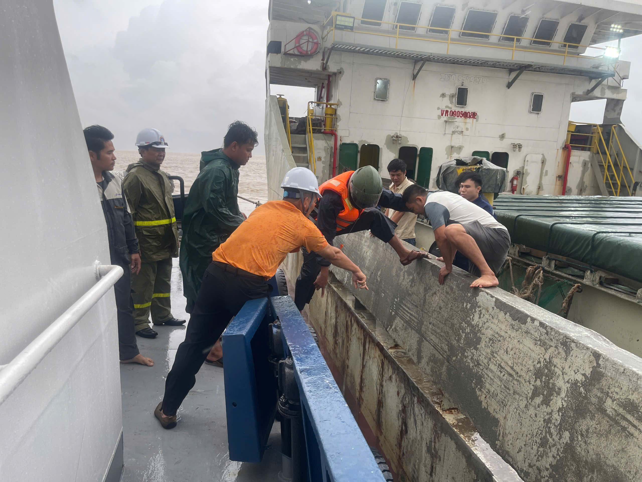 Vượt qua điều kiện thời tiết khắc nghiệt, tàu Long Son 38 đã tiếp cận được 02 phao bè cứu 08 thuyền viên lên tàu trong tình trạng sức khỏe suy kiệt, hoảng loạn.