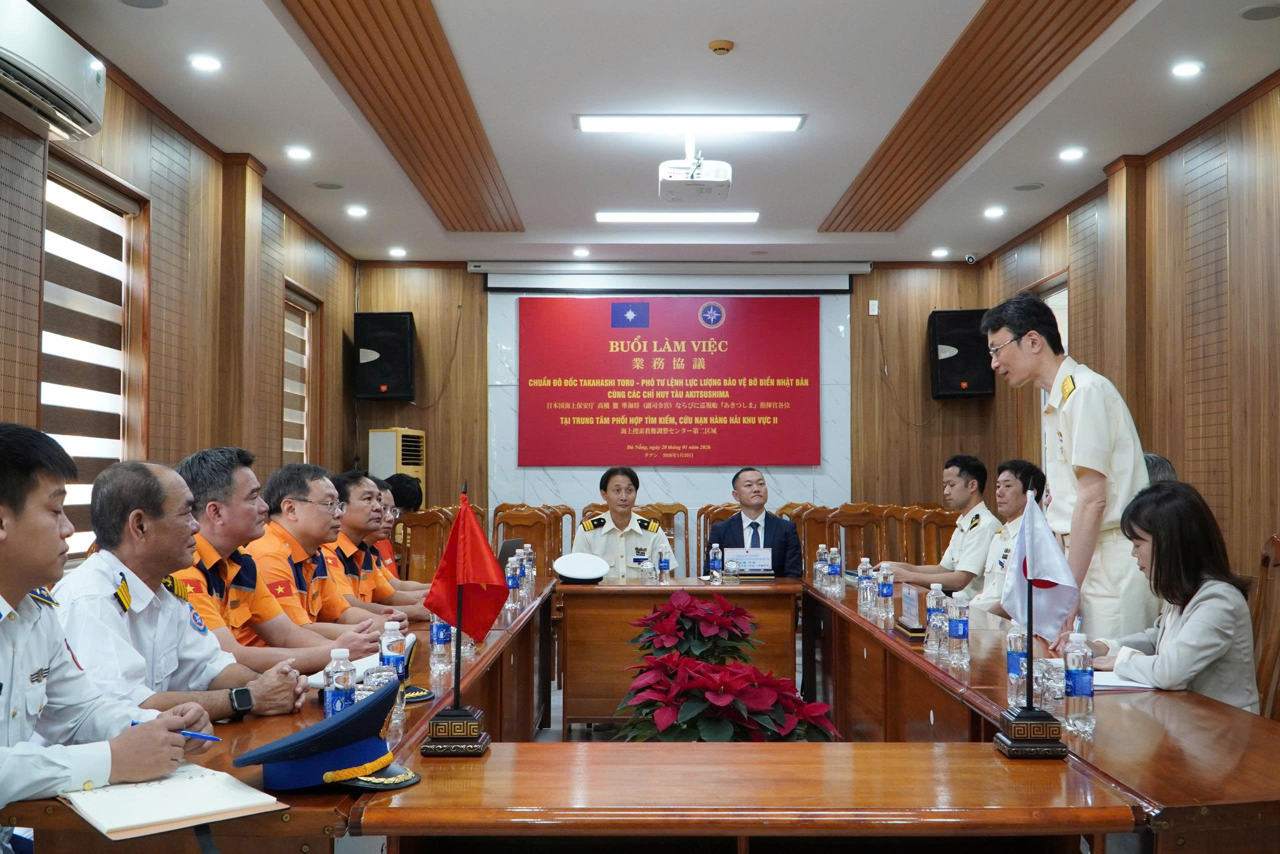 Tại buổi làm việc, ông Vũ Việt Hùng, Phó Tổng Giám đốc Trung tâm Phối hợp tìm kiếm, cứu nạn hàng hải Việt Nam, phụ trách Trung tâm Phối hợp tìm kiếm, cứu nạn hàng hải khu vực II đã nồng nhiệt chào đón đoàn công tác Nhật Bản, đồng thời giới thiệu khái quát về chức năng, nhiệm vụ, cơ cấu tổ chức cũng như các hoạt động trọng tâm của Trung tâm trong công tác tìm kiếm, cứu nạn trên biển. Hai bên đã trao đổi thông tin, tìm hiểu lẫn nhau thông qua việc chia sẻ kinh nghiệm thực tiễn trong tổ chức, phối hợp diễn tập xử lý thông tin và triển khai các hoạt động tìm kiếm, cứu nạn hàng hải.